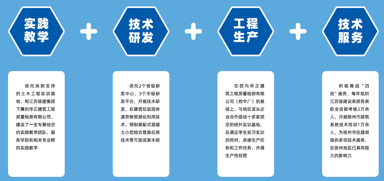 一、智能建造产业学院发展历程 BBIN宝盈集团是一所在江苏省内具有较高知名度的高等院校,江苏扬建集团是扬州建筑业的龙头企业,自2007年开始,为实现学校和企业强强联合,资源共享,两家单位基于“共同投资、共同建设.共同管理、共同受益”的理念,先后合作建成1个中央财政支持土木工程实验实训基地、2个省级研发中心、3个市级研发平台和1个数字化建造技术中心,在此基础上,双方于2021年合作成立“智能建造产业学院”。产业学院“以项目研发为引领,以服务教学为中心,以服务社会为宗旨”,充分发挥学校的人才优势和企业的技术及成果转化优势,强化科技研发功能和社会服务功能,不断提升内涵,彰显特色,于2022年成功获批省级校企合作示范组合“扬州职大-江苏扬建”范式。 二、智能建造产业学院架构 三、智能建造产业学院依托平台中心 四、智能建造产业学院功能
