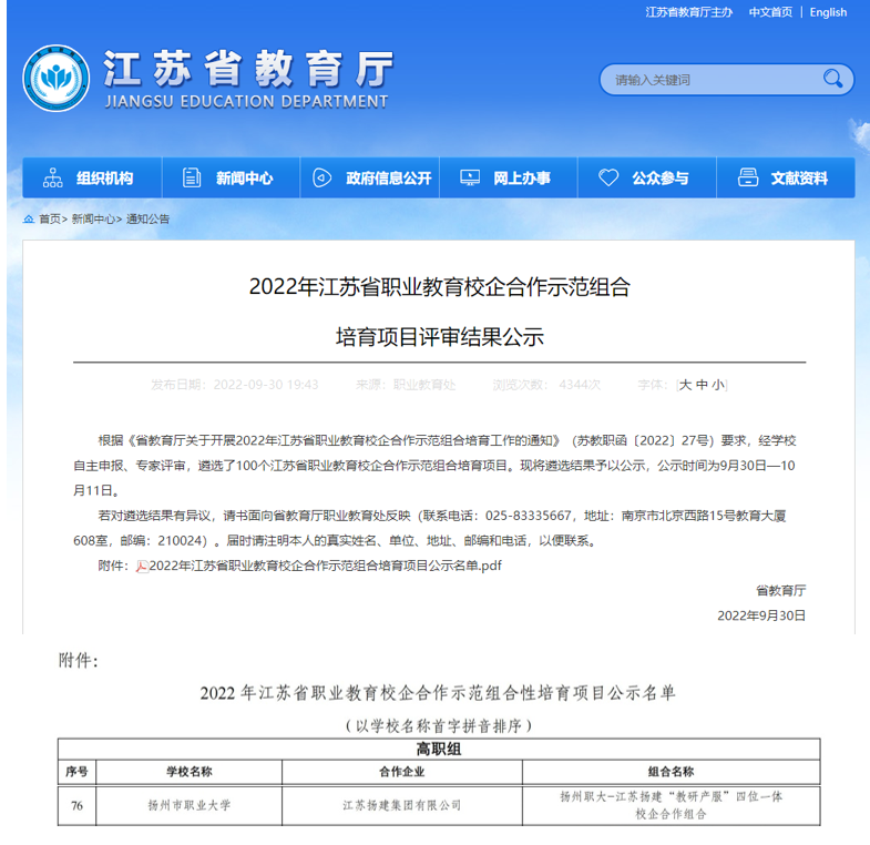 王逸菲、仇华兴 近日,江苏省教育厅发布了《2022年江苏省职业教育校企合作示范组合培育项目评审结果公示》的通知,公司与江苏扬建集团有限公司组建的扬州职大-江苏扬建“教研产服”四位一体校企合作组合培育项目获批。 为贯彻落实《中华人民共和国职业教育法》,深化我省职业教育产教融合、校企合作,提升技术技能人才培养水平,省教育厅开展了2022年江苏省职业教育校企合作示范组合培育工作。校企合作示范组合由BBIN宝盈集团和江苏扬建集团有限公司联合,双方建立长期、稳固、深入的合作关系,在现代学徒制、产教融合实训基地建设、产业学院建设、专业课程资源建设、技术服务与人才培训等方面取得突出成效,具有示范和引领作用。 今后,将进一步积极拓展校企合作的深度和广度,发挥合作示范组合的引领作用,在人才培养、专业建设、技术创新、社会服务等方面创新性的开展工作,为全面提升学校技术技能人才培养水平做出贡献。从企业订单培养、现代学徒制、校企工学交替、双主体育人入手,逐步探索、开展校企合作新模式。企业积极参与学校专业、课程、实验室等建设,校企共同开发专业标准、课程、教材、教学资源等,教学内容能紧跟产业技术发展不断更新。围绕产业链需要及新技术发展需求,及时调整专业教学计划,不断加大实习实训占比。与企业开展多层次多形式的合作办学,建立招生、培养、就业联动机制。充分挖掘学校和企业现有资源,新建和引进有机结合,系统设计校企合作平台,组建“实验实训平台、技术研发平台、工程生产平台、技术服务平台”四大载体。